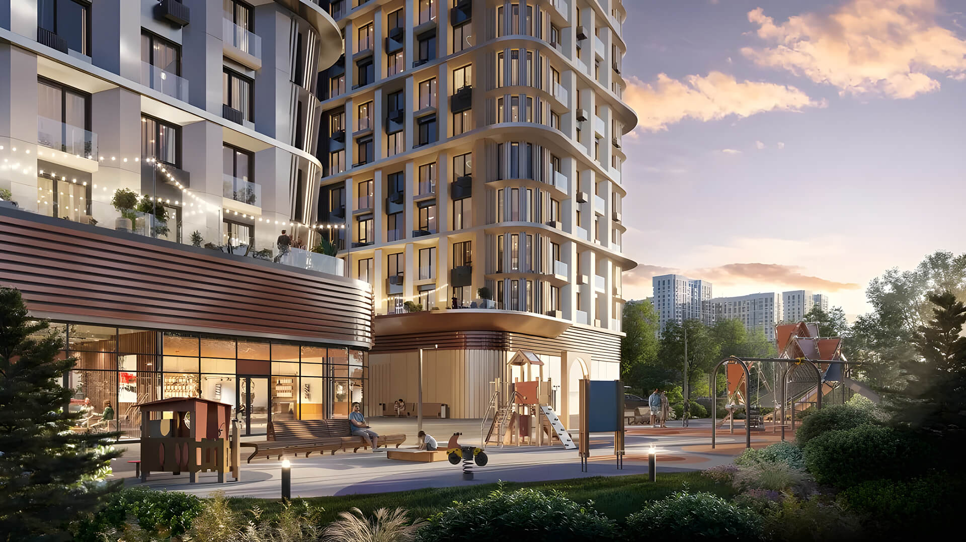 Территория комплекса делится на функциональные зоны: тихие зоны отдыха с лавочками и декоративным освещением, игровые площадки для детей разных возрастов, площадки для воркаута и занятий спортом на свежем воздухе. В вечернее время включается архитектурная подсветка зданий и благоустройства, создавая уютную и безопасную атмосферу. Ландшафтный дизайн выполнен с применением многолетних растений, клумб, рулонного газона и живых изгородей, что позволяет сохранять привлекательный вид территории в течение всего года.